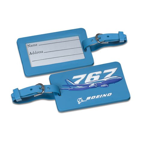This luggage tag displays a dimensional airplane decoration and Boeing logo molded in PVC. Measures approximately 3.25" x 2". Imported